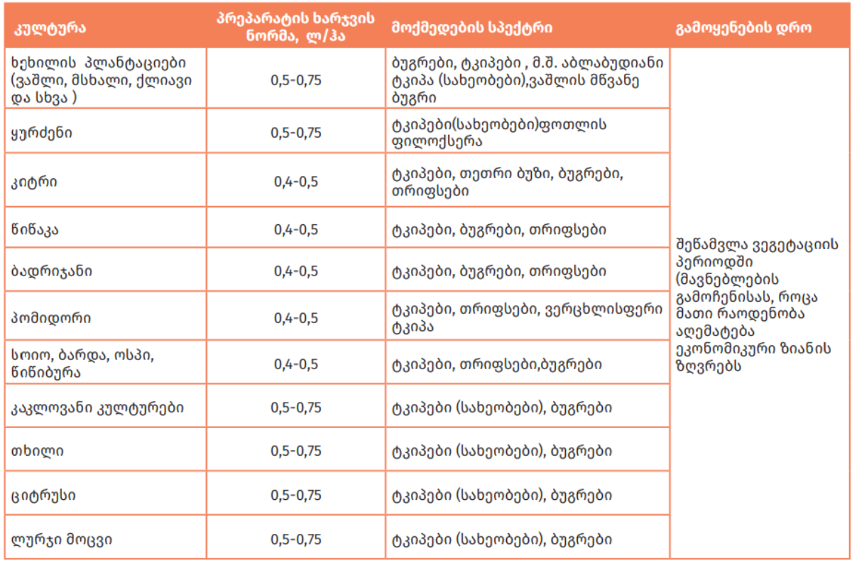 მოცვი – 250-400 ლ/ჰა, კაკლოვან კულტურებში –