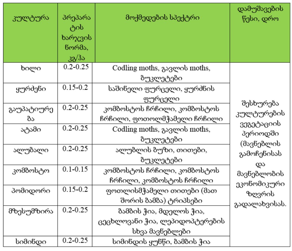 - ლოდინის პერიოდი ბოლო დამუშავებიდან მოსავლის აღებამდე არის 14 დღე.