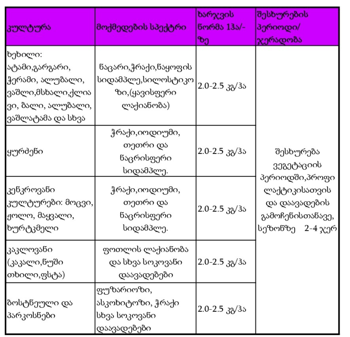 დამუშავების მაქსიმალური სიხშირე სეზონზე 4-ჯერ კულტურის მიხედვით