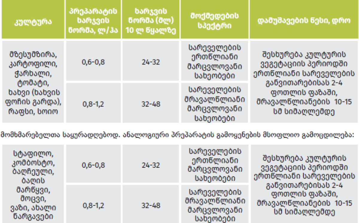 - მოქმედების გახანგრძლივებული ვადის გამო შეიძლება გამო-ყენებული იქნეს სოფლის მეურნეობის კულტურების ზრდის ფა-ზების ფართო დიაპაზონში