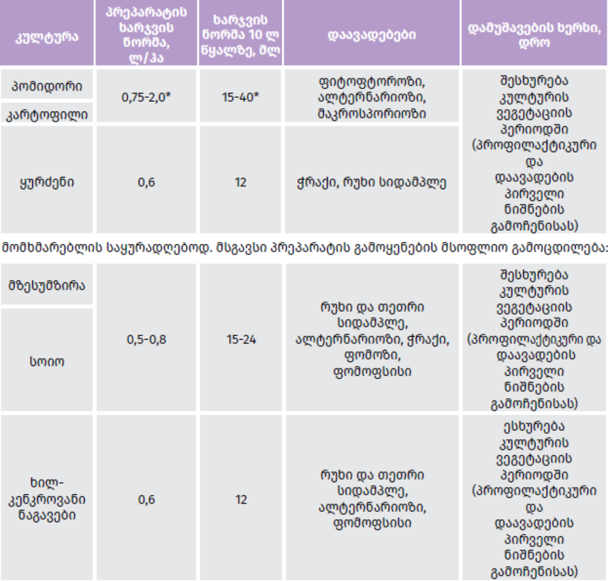 პროფილაქტიკური და სამკურნალო მოქმედების კომბინირებული ფუნგიციდი, ბოსტნეული კულტურებისა და ყურძნის მრავალი დაავადებისაგან დასაცავად.