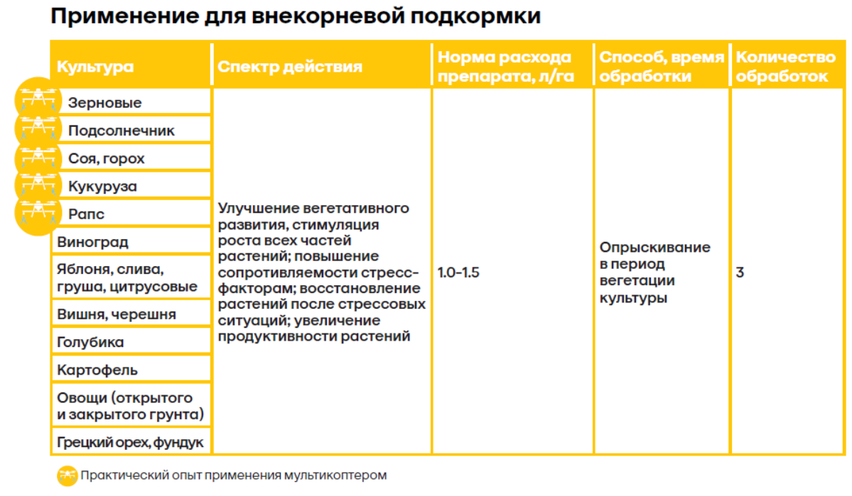 Выполняет функции антистрессанта, стимулятора роста, адаптогена, криопротектора и прилипателя. Удобрение стимулирует синтез белков, углеводов и фитогормонов, повышает иммунитет культур, улучшает цветение и урожайность, образует на листьях защитную плёнку, удерживающую влагу и усиливающую эффективность пестицидов. Применяется для обработки семян (1,0–2,0 л/т), внекорневой подкормки (1,0–1,5 л/га), фертигации (1,5–3,0 л/га) и гидропоники.