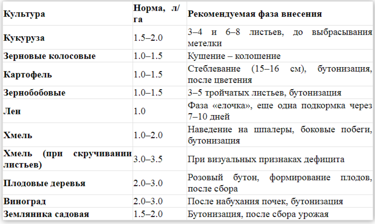 Особенно эффективно для кукурузы, рапса, хмеля, бобовых и плодовых культур, особенно на карбонатных и холодных почвах. Рекомендуется внекорнево в норме 1,5–3,5 л/га, рабочий раствор – 200–1000 л/га. Совместимо с большинством удобрений и СЗР, возможно предпосевное применение (0,5–1,0 л/т семян).