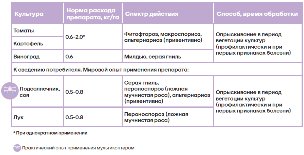 Учитывая биологию возбудителей фитофтороза картофеля и томатов, милдью винограда, повторные обработки планируют заранее, особенно при благоприятных для патогенов гидротермических условиях. Опрыскивание целесообразно проводить при температуре воздуха +12…+25 °С и при оптимальной влажности воздуха (не менее 40-50%). Скорость ветра