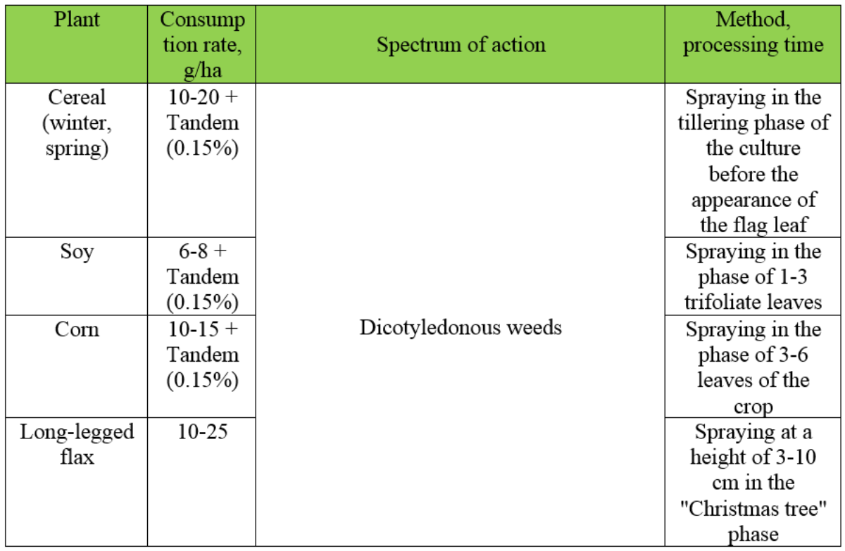 Be sure to add Tandem adhesive when spraying at the rate of 150 ml per 100 liters of water, regardless of whether the drug is used in a mixture or on its own. Spraying must be carried out in the phase of cotyledons – 4 leaves in weeds. Within 7 days before or after applying the drug, inter-row tillage is not carried out. It is not recommended to use the drug at temperatures below 10 and above 25 °C. In dry and hot weather, spraying should be done in the morning and evening hours. It is not recommended to make tank mixtures with drugs from the group of organophosphorus compounds. The interval between processing in such cases should be at least 10 days.