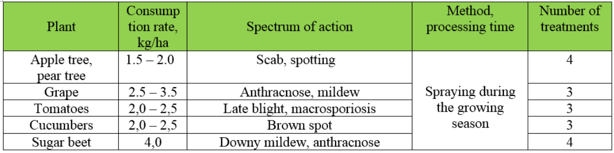 Application rate of the working solution: pome fruits: 800-1000 l/ha; berry crops: 500-900 l/ha; vegetables: 200-400 l/ha